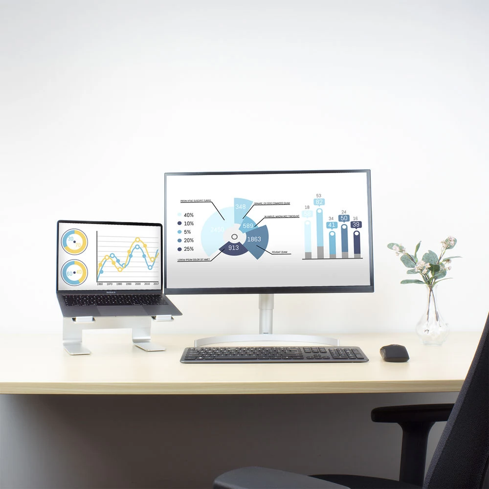 Aluminijasto stojalo za prenosnik je primerno za prenosnike do 15,6". Nedrseče gumijaste podloge ohranjajo prenosnik na mestu. Prostor pod prenosnikom lahko uporabite za shranjevanje tipkovnic, dokumentov in drugih zunanjih naprav.