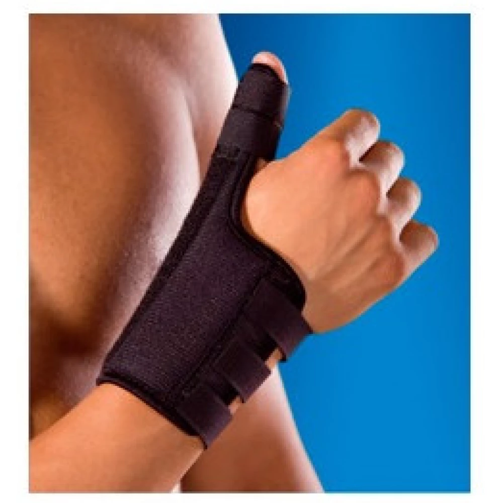 Udoben izdelek, podložen s peno, s plastično opornico in 3 ježki, pritrdi in podpira prst v primeru poškodbe palca, natega tetive ali oslabelosti mišic. Primeren za vsakodnevno uporabo.