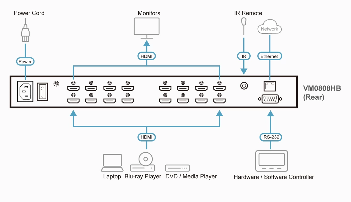 - 1x VM0808HB 8X8 Real 4K HDMI Matrix Switch