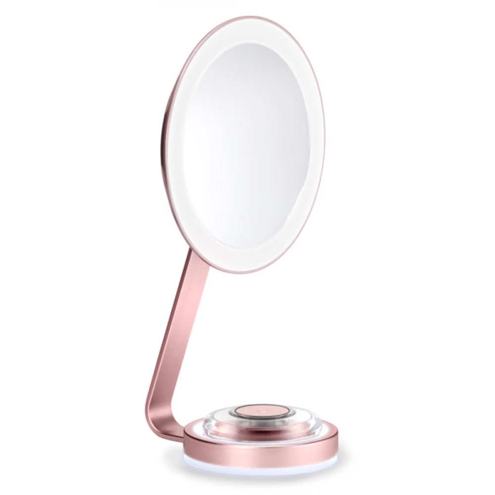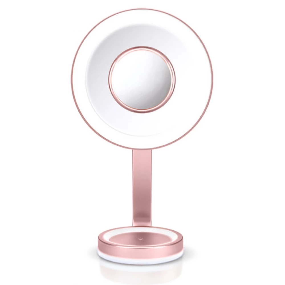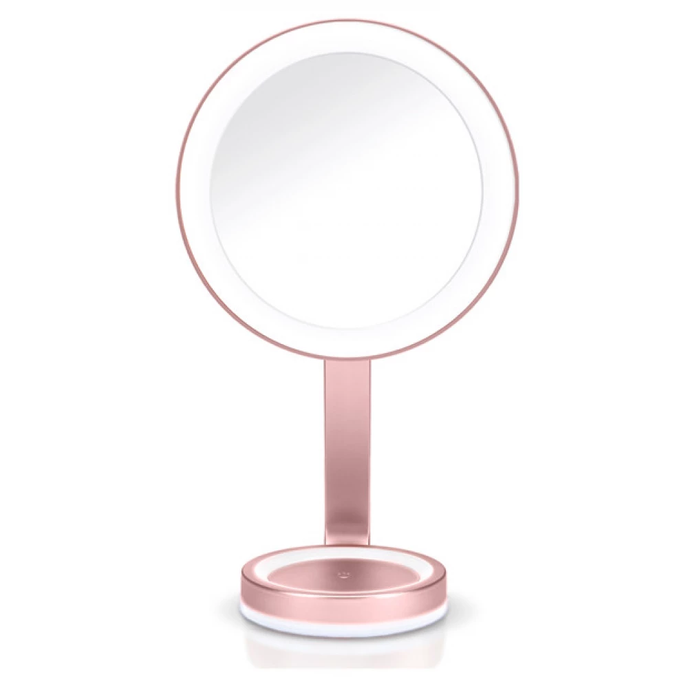 Saten, roza, kozmetično ogledalo z LED osvetlitvijo. Odstranljivo, magnetno dodatno ogledalo z 10x povečavo, ki ga lahko namestite na veliko ogledalo ali na podstavek.