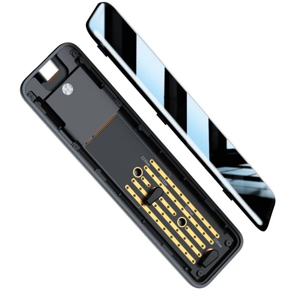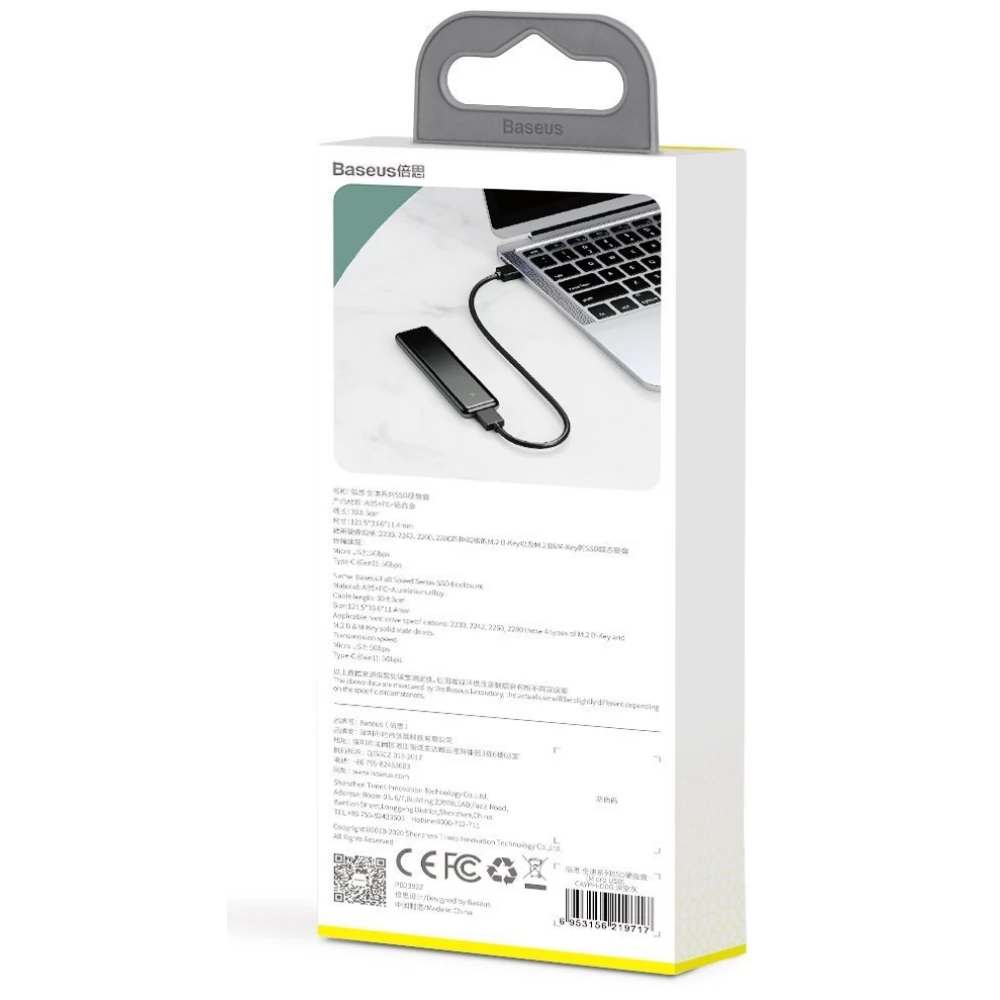 Zunanje ohišje Baseus SSD Enclosure USB-C je izdelano iz ABS, PC in aluminija. Omogoča hitrost prenosa podatkov 5 Gbps preko priključka USB-C.Združljive naprave: 2230, 2242, 2260, 2280 M.2 B-Key in M.2 B & M-Key.