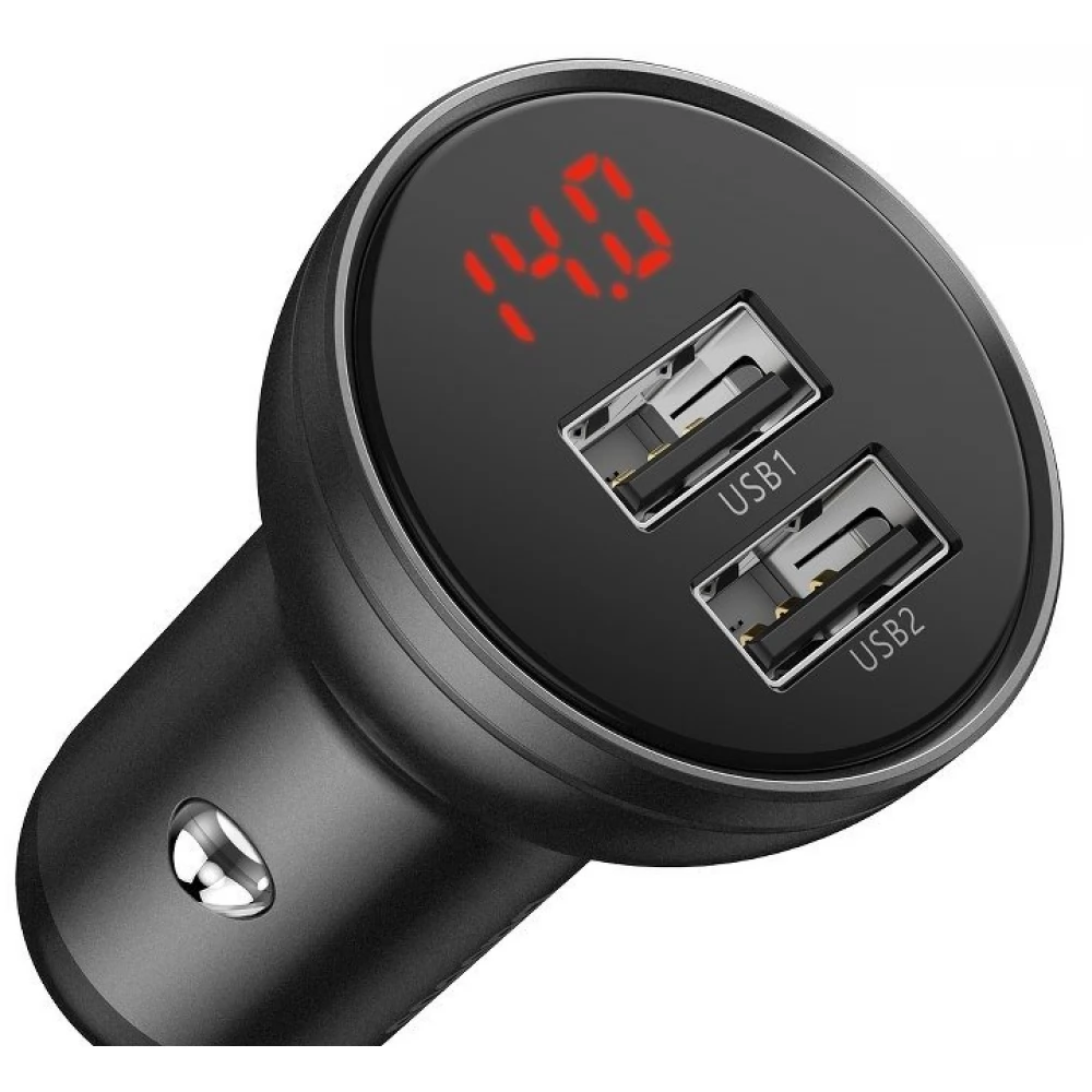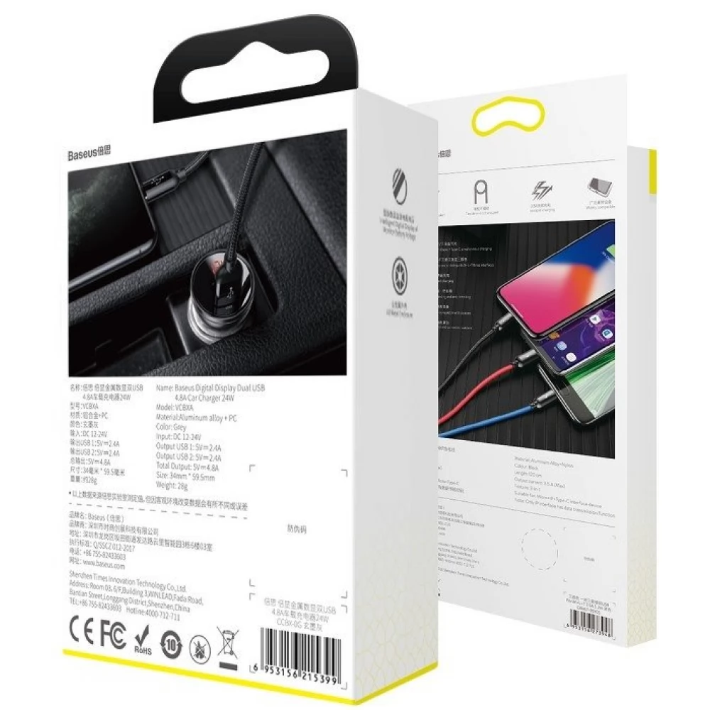 Polnilec za vžigalnik Baseus 3 v 1 4,8 A. Avtopolnilec Baseus 2USB 4,8A 24W z LCD zaslonom in polnilnim kablom 3v1 Inteligentni avtopolnilec s prikazom polnilne napetosti. Kompaktna naprava: z 2 vhodoma USB, skupni izhodni tok 24 W / 4,8 A. Odličen je tudi za polnjenje baterij mobilnih naprav, pametnih telefonov ali tablic. Izdelan je iz visokokakovostnega materiala. Izdelan je iz kombinacije ognjeodpornih in vzdržljivih materialov: PC in ABS. Odporen na padce in prekomerno vročino. USB polnilni kabel s 3 različnimi priključki: USB-C / micro USB / Lightning. Hitro in varno polnjenje - tok 3,5 A in žica iz čistega bakra omogočata hitrejše in varnejše polnjenje. Ojačana povezava - Najbolj kritična točka nekaterih kablov je povezava med kablom in vtičem, ki je dodatno ojačana, da prepreči razpoke. Inteligentni upravljalni čip - Prilagodi optimalen tok za vsako napravo. Zagotavljamo stabilnejše in učinkovitejše polnjenje. Aluminijasti konektorji - Visokokakovosten konektor iz aluminijeve zlitine, odporen proti oksidaciji in koroziji. Najlonska pletenica - Elastična vrvica je izdelana iz močne in trpežne najlonske pletenice.
