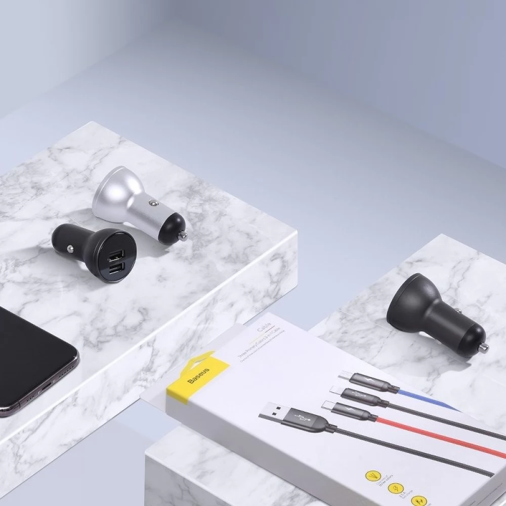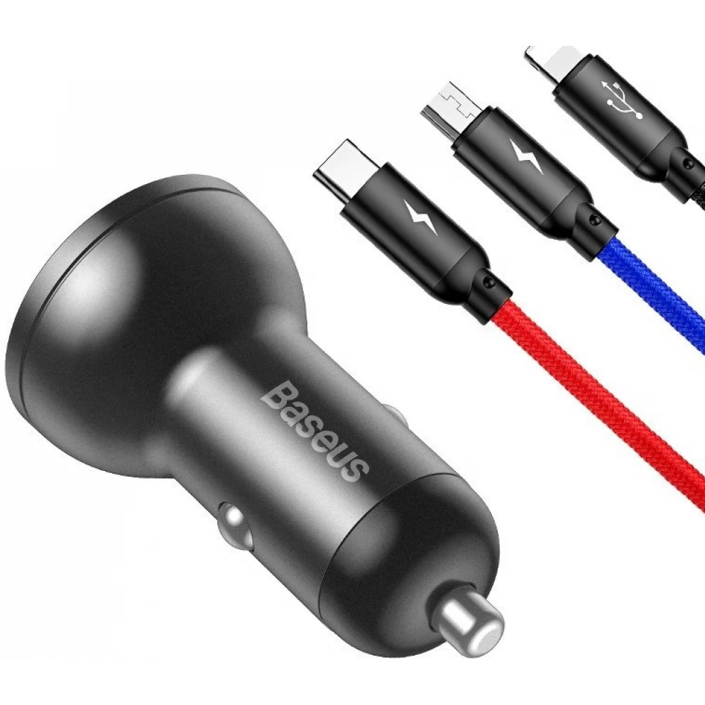 BASEUS Three Primary auto punjač 2xUSB 24W 3in1 kabel za punjenje crno