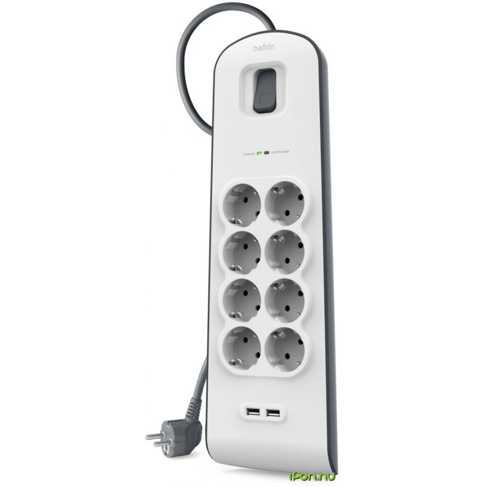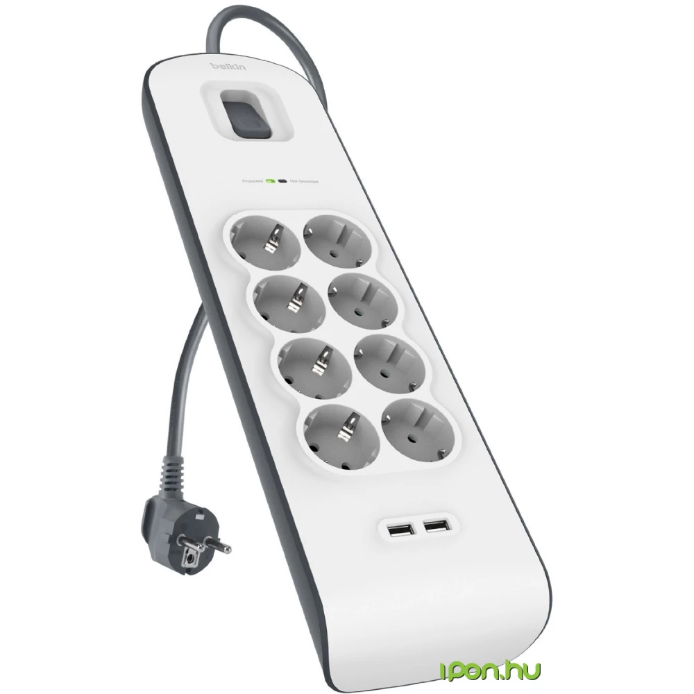 Ponuja vam praktično, prenosno možnost za zaščito domače pisarne in naprav za domači kino pred napetostnimi sunki, napetostnimi konicami in kontaminacijo zaradi električnega toka. 8 vtičnic nudi odlično zaščito pred prenapetostjo za prenosnike, televizorje, kabelske sprejemnike in druge naprave za domači kino. Dva praktična USB priključka (2,4 A) se uporabljata tudi za polnjenje mobilnih naprav prek vira. Dovolj je, da prenapetostno zaščito priključite na vtičnico v stanovanju ali pisarni. Nato boste videli zeleno lučko, ki označuje, da prenapetostna zaščita deluje. Poškodbe, izgubo podatkov, poškodbe datotek in zrušitve sistema je mogoče preprečiti zahvaljujoč sodobnemu dizajnu, dragoceni konstrukciji ter Belkinovim vrhunskim vezjem in komponentam. Veliko stikalo za vklop in izklop lahko priročno vklopite. Ker ima vdolbino, se lahko po nesreči izklopi.