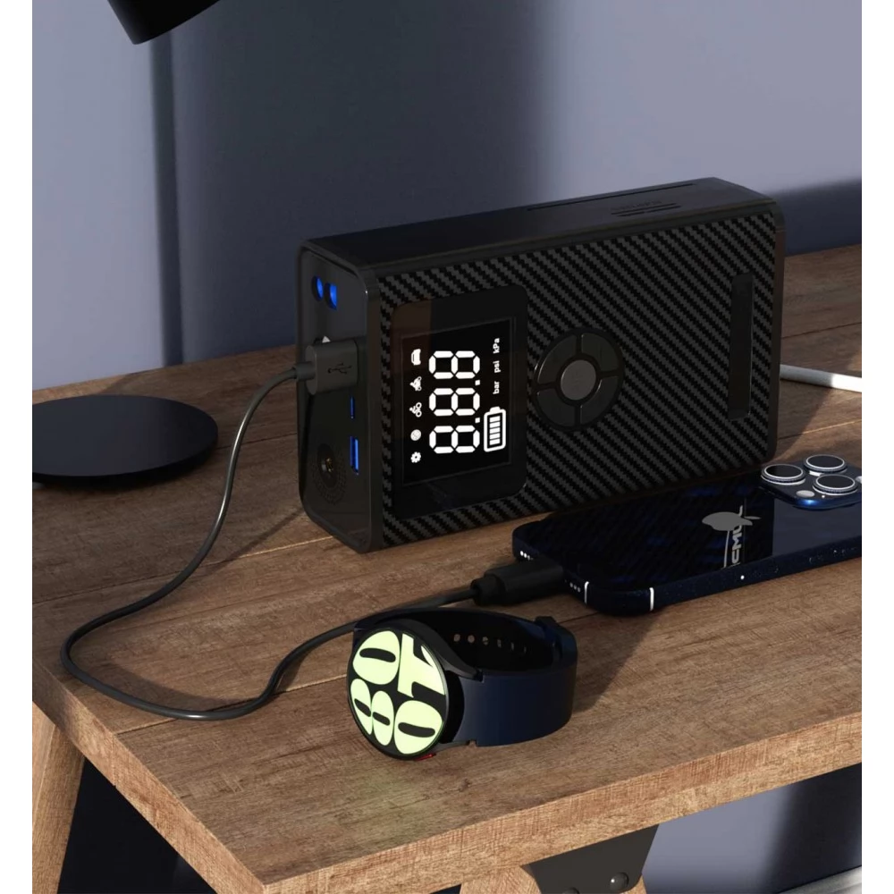 S prenosnim zaganjalnikom 5-V-1 lahko zaženete avto, napolnite avtomobilsko gumo/kolo/žogo, napolnite mobilne telefone, tablice in druge elektronske izdelke.