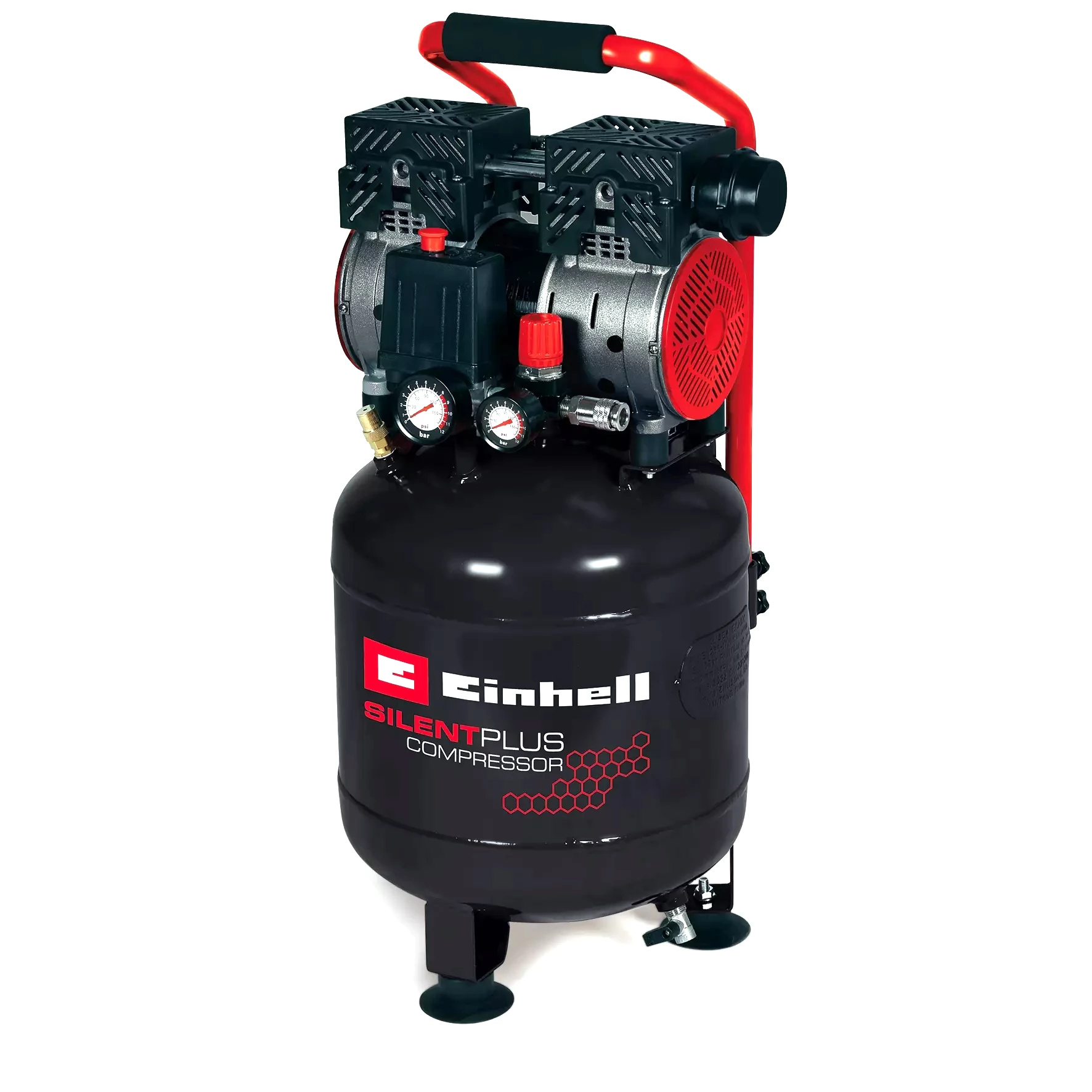TE-AC 135/24 Silent Plus kompresor je večnamenska osnovna naprava, ki je ne more manjkati v nobeni garaži ali delavnici! Emisije nizkega hrupa kompresorja naredijo 57pcs (LPA/zvočni tlak) edinstvene. Naprava je izjemno tiha in zahvaljujoč 750 vati moči, vedno ste lahko prepričani, da bo vedno deloval zadostne količine in intenzivnost zraka. Kompresor je bistveno tišji od običajnih kompresorjev z enako močjo. Naprava je zasnovana z motorjem z nizkim vzdrževanjem, oljem in brez vzdrževanja. Odtočni vijak je udoben in enostaven za vzdrževanje. 24-litrski vsebnik vedno zagotavlja zadostne količine zraka, da priključi ustrezna orodja, da v nobenem trenutku absorbirajo barvne in lastne plasti. Večje površine lesa lahko enostavno impregnirate z oljem namesto barve. Bi ga radi uporabili za barvanje ali peskanje? Kompresor stoji na obeh območjih! Lahko preprosto napihnete kroglice, gumijaste vzmetnice ali avtomobile in (motorna) kolesa. Einhell zaupa kakovosti svojih izdelkov, zato rezervoarju dajemo 10 -letni nerjavni garanciji. Z uporabo reliefnega tlaka kompresorja max. Uporablja se lahko za številne naloge do 8 barov. Kompresor je opremljen z merilnikom tlaka in hitrim priključkom, ki vam omogoča delo z nadzorovanim delovnim tlakom. Na kompresorju je še en merilnik tlaka, ki prikazuje tlak v rezervoarju. Za varnost uporabnika je na voljo varnostni ventil. Kompresor se lahko pretvori v nekaj gibov. Noge z vibracijami -noge, ki jih prinašajo, zagotavljajo največjo stabilnost med uporabo. Napravo lahko shranite v nastavljeni položaj.
