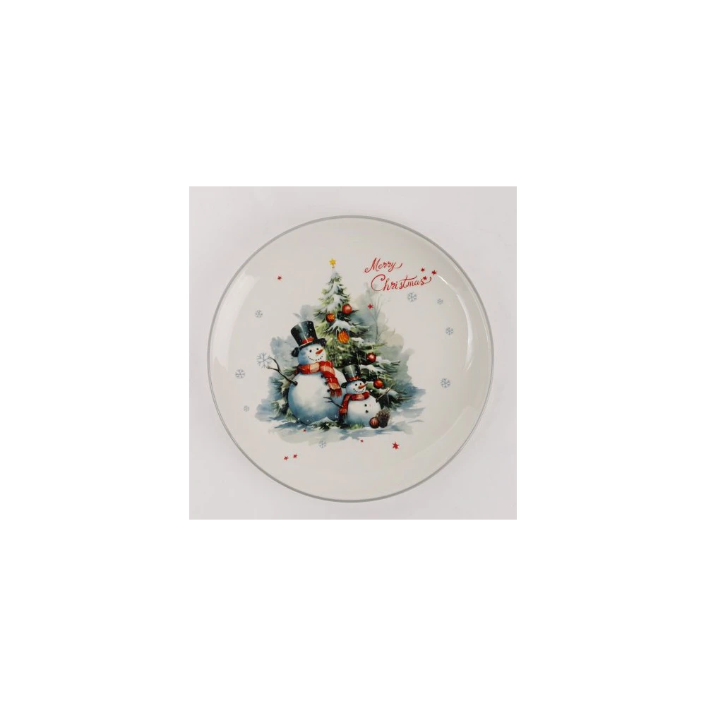 Keramični krožnik, snežaki pred jelko, napis "merry christmas" 25 cm.