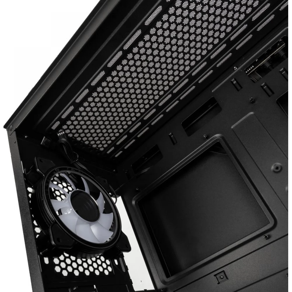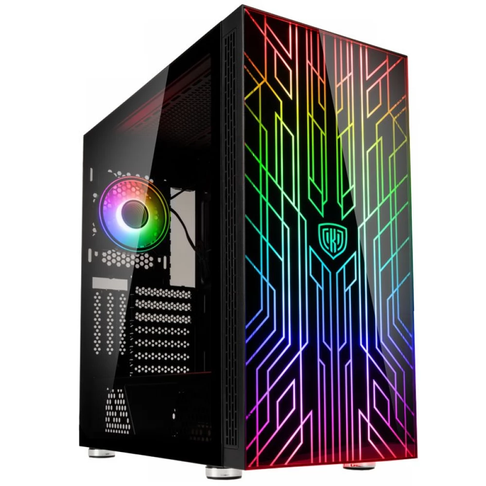 Računalniško ohišje formata E-ATX Midi tower z vizualnimi elementi RGB.