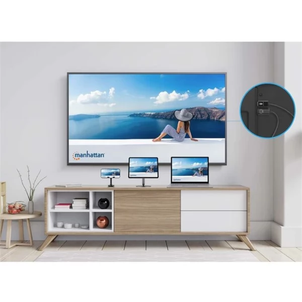 Brezžični komplet za adapter HDMI Manhattan 1080p lahko enostavno odraža ali razširi zaslon naprave USB-C na katero koli HDMi-združljivo televizor, projektor ali monitor-popolna predstavitev, profesionalno usposabljanje in pretakanje videov brez odvečnih kablov.