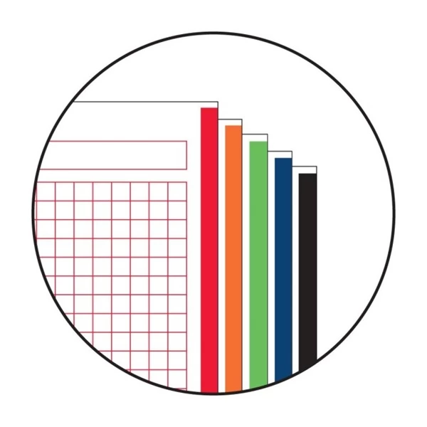 90 g visokokakovostna bela papir. Prosojna platnica PP. Mikroperfoizirani in prebijani, barvni listi.