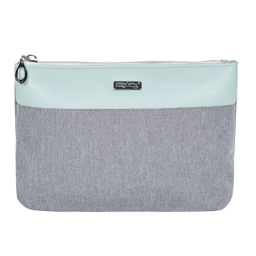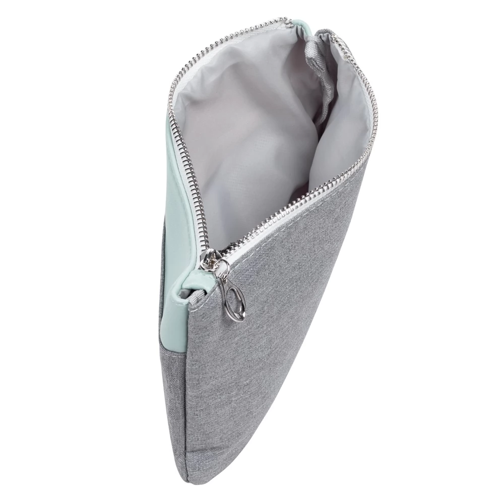 Kozmetična torbica v sivo-zelenem dizajnu, zapiranje z zadrgo. Primeren za shranjevanje manjših predmetov v torbici.