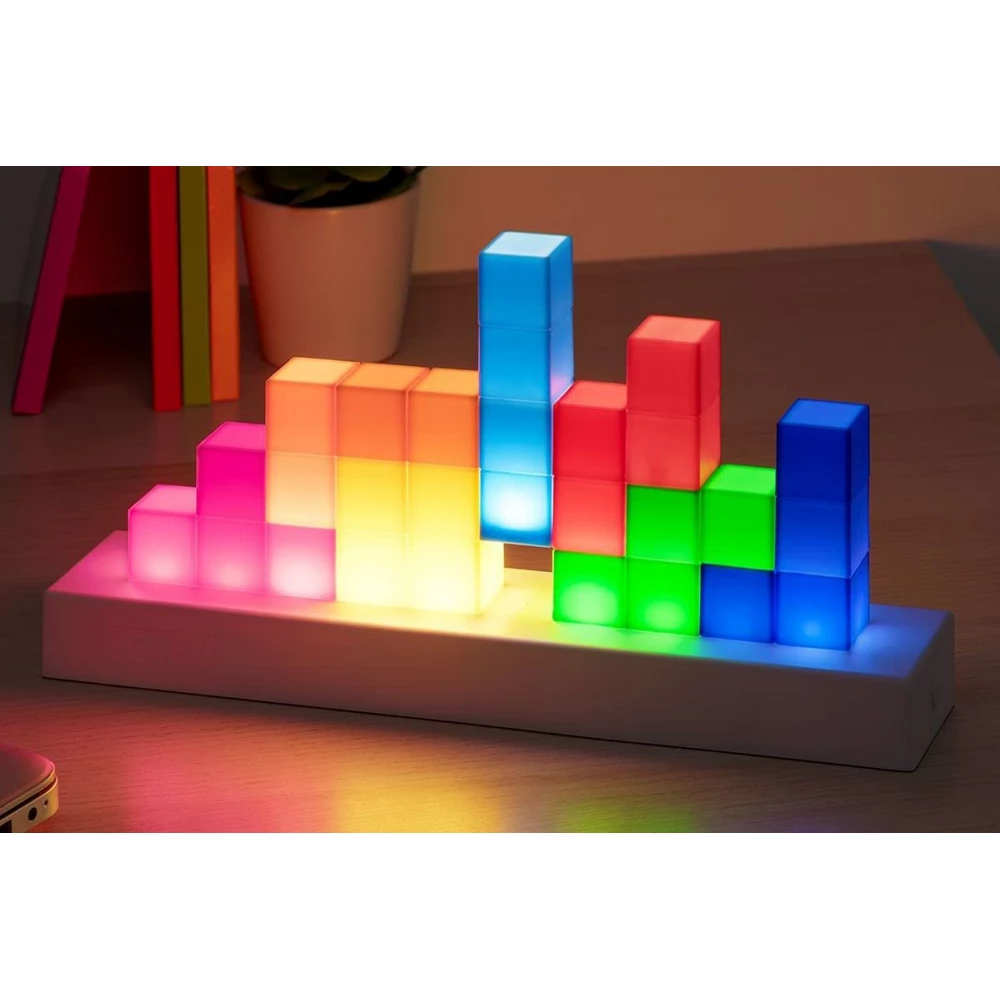Svetilka, izdelana v legendarnem slogu Tetris, je odličen stilski dodatek za vsak dom! Lučko lahko uporabljate v 3 načinih – običajna svetloba, spreminjanje barv ali lahko utripa ob glasbi! Napajanje se izvaja s priloženim USB kablom ali s 3× AAA baterijami. Naj kocke osvetlijo tudi vaš dom!