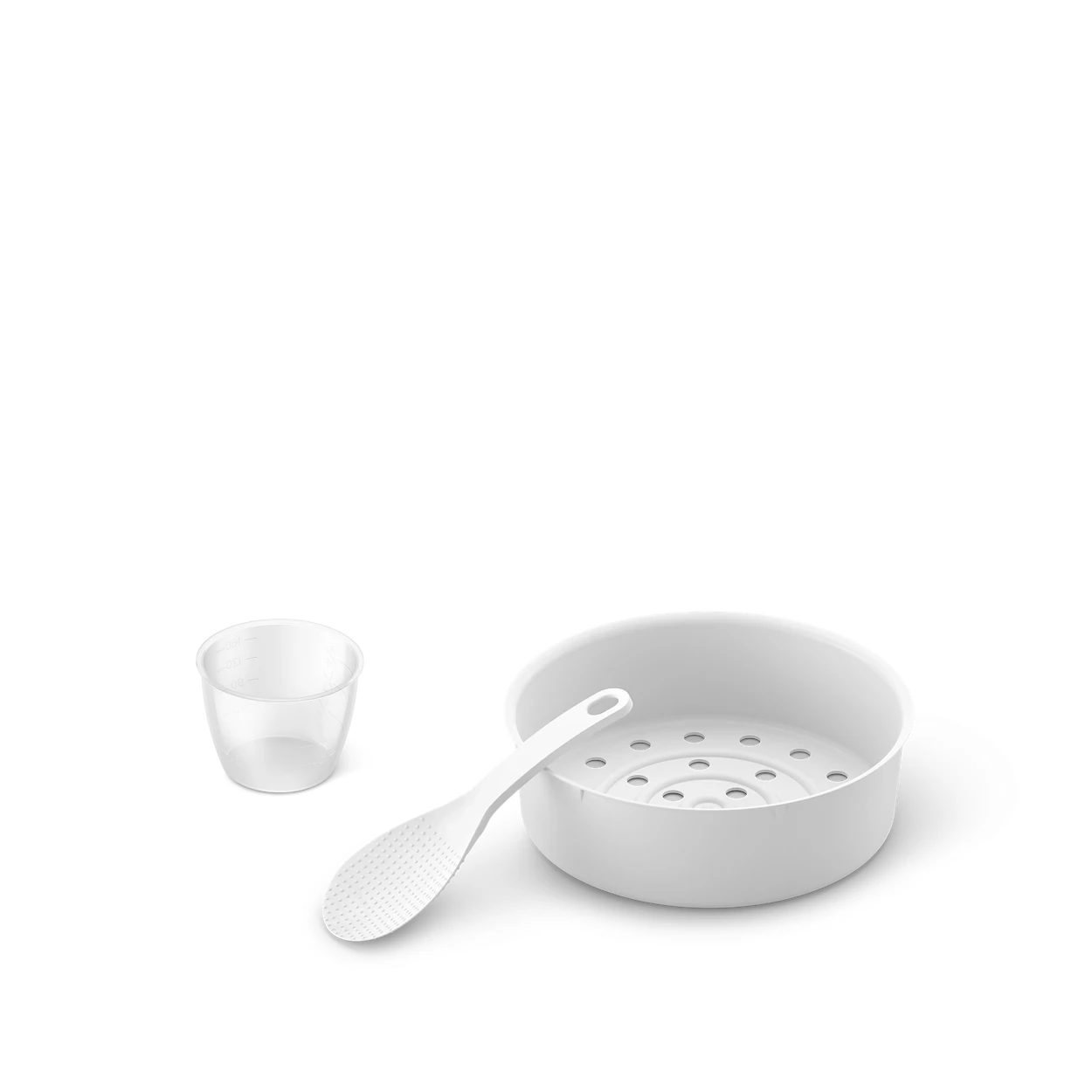 Uživajte v bolj udobnem kuhanju z našimi dodatki, ki vključujejo riževo žlico, praktično merilno skodelico in parno košaro za brezskrbno doživetje kuhanja.