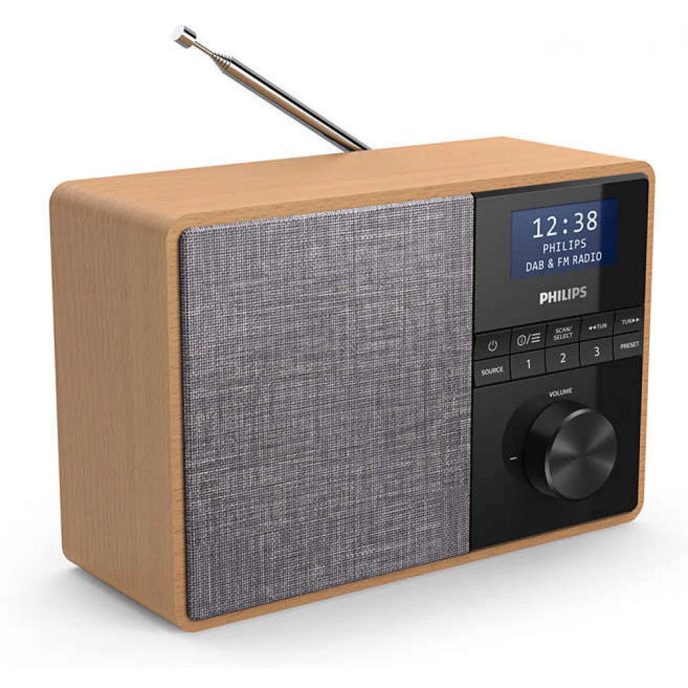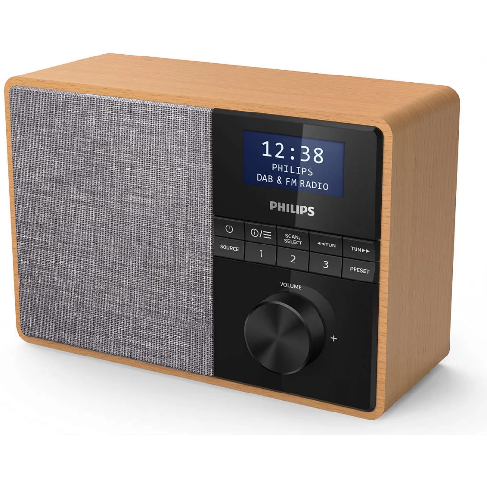 Svetle lesene obloge obdajajo sijočo črno ploščo zaslona in zvočnik, ki je prekrit s sivo tkanino za zvočnike. Gumbe na sprednji strani radia lahko uporabite za uglasitev, izbiro vira itd. Glasnost lahko nadzirate z elegantnim vrtljivim gumbom.