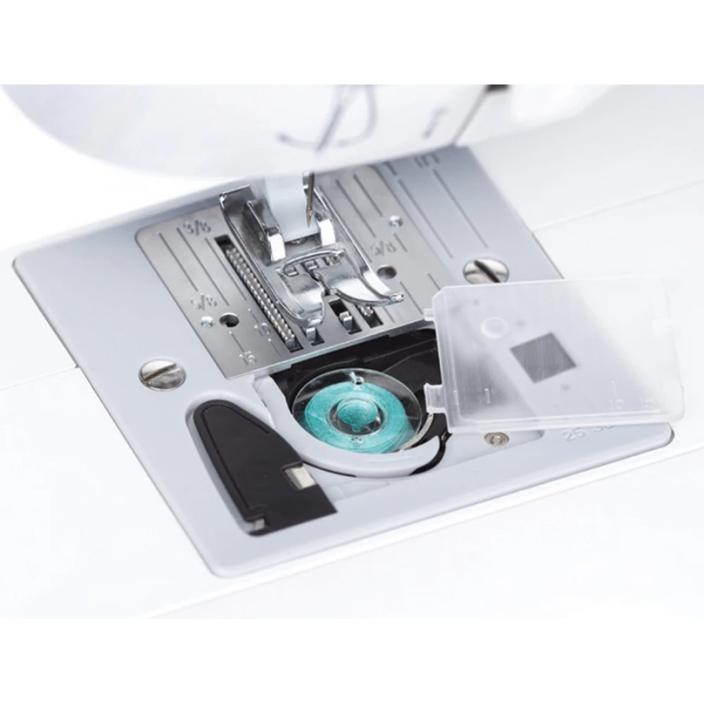 - Ostali pripomočki: 3 strojne igle, vodilo za vrstico, pokrivna folija za zobe, 4 plastični vretenci, odstranjevalec gumbnic, čistilna krtačka, izvijač, obroč iz filca za dušenje vretena, rezervno držalo sukanca, stiskalna plošča za vreteno