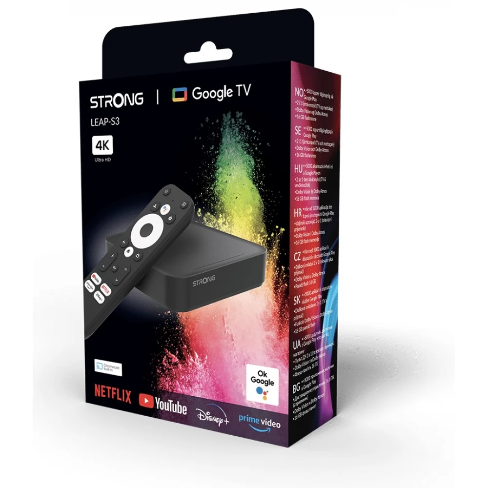 Ta majhen, kompakten, pametni sprejemnik Google TV je prava izbira za vaš TV. Povežite STRONG LEAP-S3 in nadgradite svoj TV na Smart TV z neposrednim dostopom do trgovine Google Play! Ta Google TV box je opremljen z najnovejšo različico Androida 11 in zagotavlja odlično uporabniško izkušnjo. Poleg tega ima Googlov certifikat in vam omogoča dostop do številnih aplikacij, storitev pretakanja in drugega. Uživajte v svojih najljubših filmih neposredno iz Netflixa, YouTuba, Prime Video ali Disney+*. Zahvaljujoč zmogljivemu uporabniškemu vmesniku lahko hitro najdete želeno zabavo in uživate v njej. LEAP-S3 ima tudi funkcije, ki jih morate imeti, kot so ločljivost 4K UHD, dekodiranje H.265, Wi-Fi 5 Dual Band, funkcija Chromecast in več. Dolby Vision-Atmos zagotavlja najboljšo sliko in zvok, kar ste jih kdaj videli, za vaš najljubši film. S polno funkcijo Google Assistant lahko nadzorujete predvajanje, predvajate ali nadaljujete TV-oddaje in filme z glasovnimi ukazi ter dobite odgovore na vprašanja kviza. Vrata USB, Bluetooth 5.0, HDMI različice 2.1 in vrata Ethernet dopolnjujejo paket in vam ponujajo TV izkušnjo brez primere.