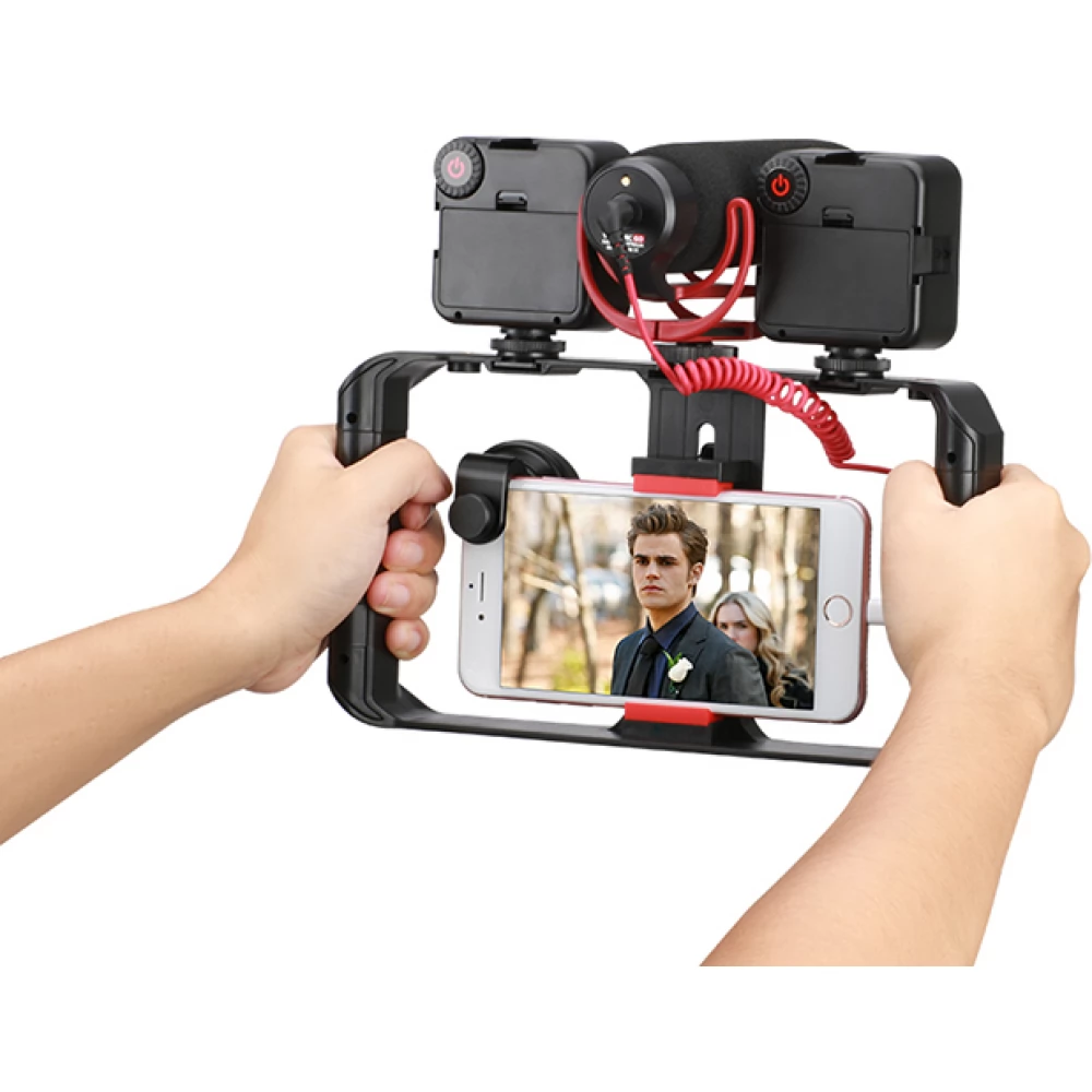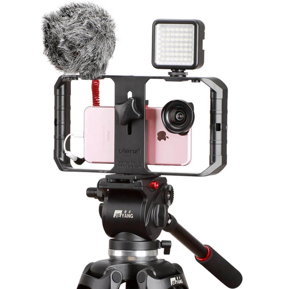 z S svojo video napravo Ulanzi U-Rig Pro lahko spremenite telefon v prenosno ročno video napravo. Pametni telefon lahko enostavno namestite na sredino naprave z adapterjem in ga pritrdite z vijakom. Adapter z vzmetjo lahko sprejme pametne telefone širine 2,0 "- 3,5".